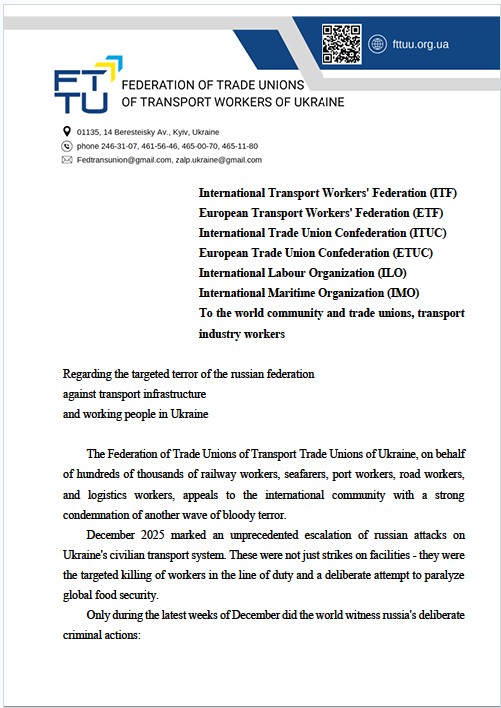 Федерація професійних спілок транспортників України від імені сотень тисяч залізничників, моряків, портовиків, дорожників та працівників логістичної сфери звертається до міжнародної спільноти з рішучим засудженням чергової хвилі кривавого терору.