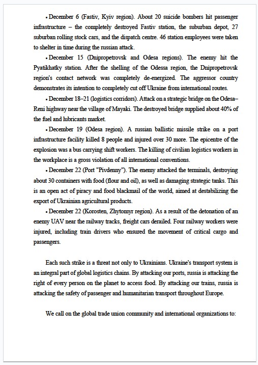 Грудень 2025 року став періодом безпрецедентної ескалації атак рф на цивільну транспортну систему України. Це не просто удари по об’єктах – це цілеспрямоване вбивство працівників під час виконання їхніх професійних обов’язків та свідома спроба паралізувати глобальну продовольчу безпеку.