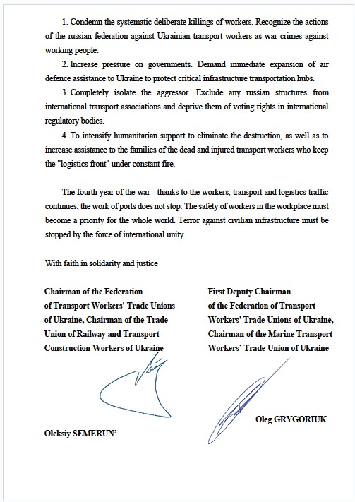Четвертий рік війни – завдяки працівникам транспортний і логістичний рух триває, не припиняється робота портів. Безпека працівників на робочих місцях має стати пріоритетом для всього світу. Терор проти цивільної інфраструктури повинен бути зупинений силою міжнародної єдності.