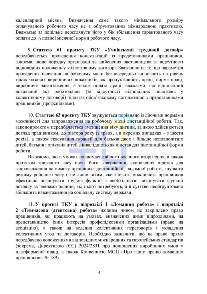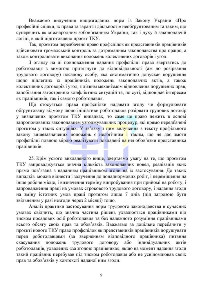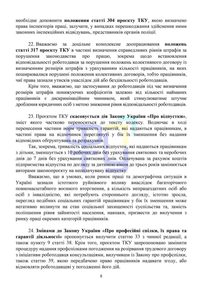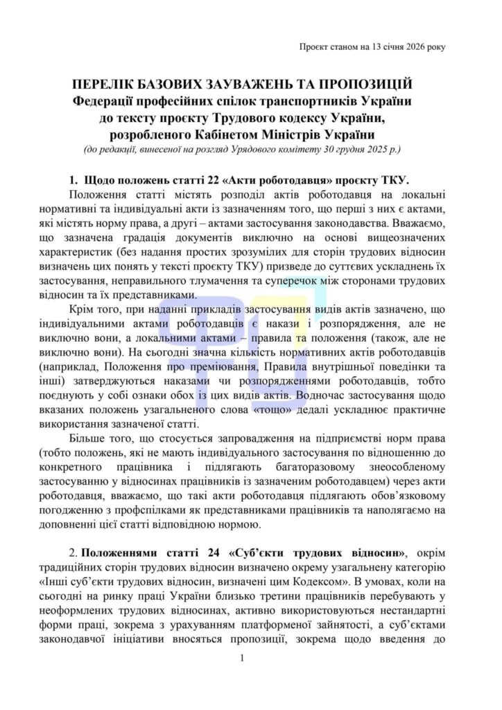 Федерація профспілок транспортників України проаналізувала текст нового проєкту, як з позиції захисту прав та інтересів сотень тисяч українських транспортників, які представляють залізничну, морську, авіаційну, автомобільну галузі, логістичну та іншу критичну інфраструктуру, так і з огляду на дотримання прав мільйонів інших українських працівників в контексті завершення війни, повоєнної відбудови та майбутньої інтеграції у спільний ринок праці з ЄС.